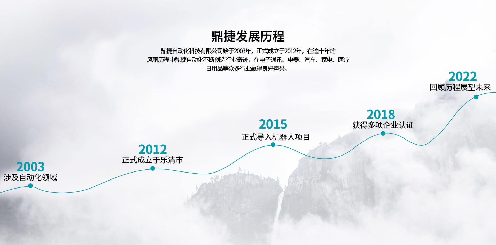 公司始于2012年,在逾十年的風雨歷程中,不斷創(chuàng)造行業(yè)奇跡,在電子通訊、電器、汽車、家電、醫(yī)療、日用品等眾多行業(yè)贏得良好聲譽。公司坐落于浙江省樂清經(jīng)濟開發(fā)區(qū),現(xiàn)有人員63人,擁有經(jīng)驗豐富的工程技術(shù)研發(fā)團隊11人,其中高級工程6人,具備本科以上學歷高級工程人員比例78%;同時鼎捷自動化在蘇州,東莞等地設(shè)立分公司以服務(wù)目標市場客戶,目前鼎捷自動化已經(jīng)為下客戶提供配套自動化解決方案:泰科、安費諾、莫士、華為、中興、普聯(lián)、智英、意華、德豐、公牛、萬事達、華豐、飛雕、普思、冠聯(lián)、俊朗松田、進聯(lián)、高正、盛凌等。鼎捷自動化專業(yè)從事連接器、開關(guān)及相關(guān)電子、電器、五金、塑膠產(chǎn)品組裝自動化定制、設(shè)計、制造、銷售。2012年,鼎捷自動化正式導入機器人應(yīng)用項目,可為各類客戶提供電子、電器、汽車、五金、塑膠等集成自動化智能組裝系統(tǒng)。